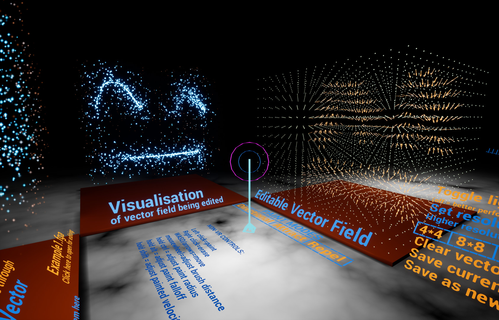 At the time (eight years ago apparently???) you’d see vector fields thrown around a lot to do impressive but not-that-interesting things with big clouds of particles. It was clearly a cool data type (weird thing to say) but I was mostly seeing fields that were random or barely-directed noise, generated by some Maya script, and my suspicion was that this was just because there was no good way to author them “by hand”. It’s 3D data, so even click-dragging through a cloud of points (which nothing would let you do anyway) was bullshit. Painting them in VR seemed like the obvious answer, although I still appear to be the only one who has made such a thing.