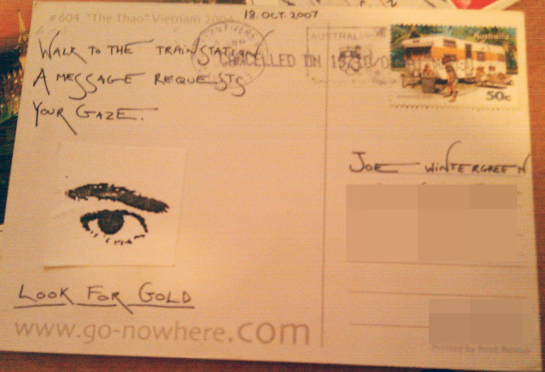 Anyway, one day I find in my letterbox a mysterious postcard. It’s got an eye on it, and it says “Wᴀʟᴋ ᴛᴏ ᴛʜᴇ ᴛʀᴀɪɴ sᴛᴀᴛɪᴏɴ. A ᴍᴇssᴀɢᴇ ʀᴇᴏ̨ᴜᴇsᴛs ʏᴏᴜʀ ɢᴀᴢᴇ.” and then “Lᴏᴏᴋ Fᴏʀ Gᴏʟᴅ“. What the fuck?